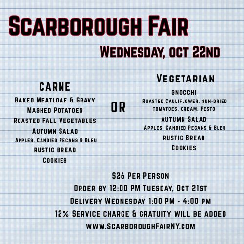 From From Scarborough Fair, try this week's special. Choice of entrees -- Baked Meatloaf OR Vegetarian Gnocchi Delicious Baked Meatloaf made from ground beef, seasoned to perfection and baked until tender and juicy. Served with Mashed Potatoes and Roasted Fall Vegetables. OR, our Vegetarian Gnocchi pillowy soft gnocchi, made with a flavorful creamy pesto sauce. Served with Roasted Cauliflower with sun-dried tomatoes. Both entrees comes with the same sides & dessert.