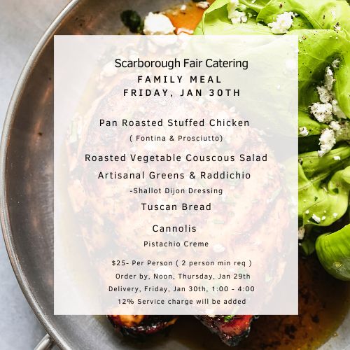Scarborough Fair's Pan Roasted Stuffed Chicken Family Meal. Hands down the absolute best chicken dinner The chicken is juicy, cooked through, and stuffed with Fontina & Prosciutto. The sauce is simple and heavenly. A great meal the whole family will love.
