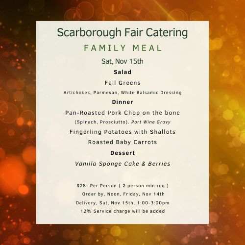 Scarborough Fair's Roasted Stuffed Pork Chop Family Meal. Our Pan-Roasted Pork Chops are exceptionally moist, seasoned with fine herbs, and cooked to perfection. Served with mashed potatoes, vegetables, and dessert. Perfect meal for the whole family.